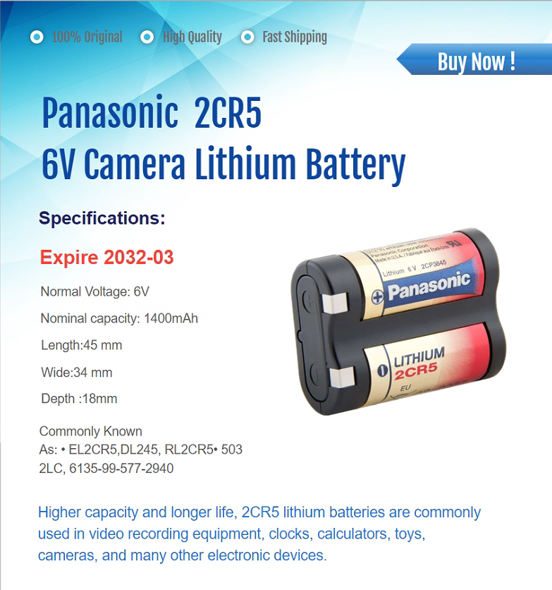Higher capacity and longer life, 2CR5 lithium batteries are commonly used in video recording equipment, clocks, calculators, toys, cameras, and many other electronic devices.