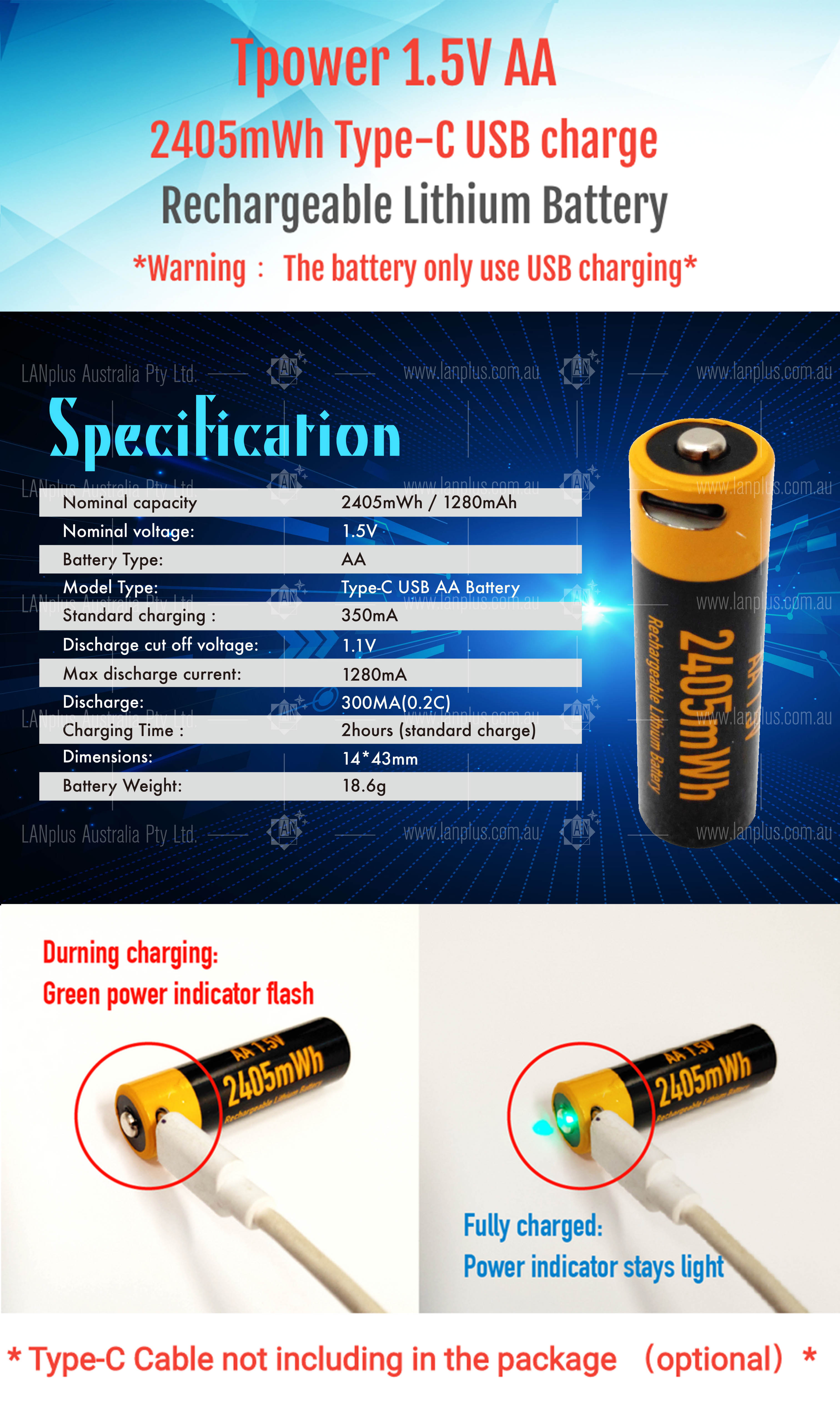 2pcs 1.5V AA 1280mAh Type-C usb 2405mWh lithium rechargeable lithium battery