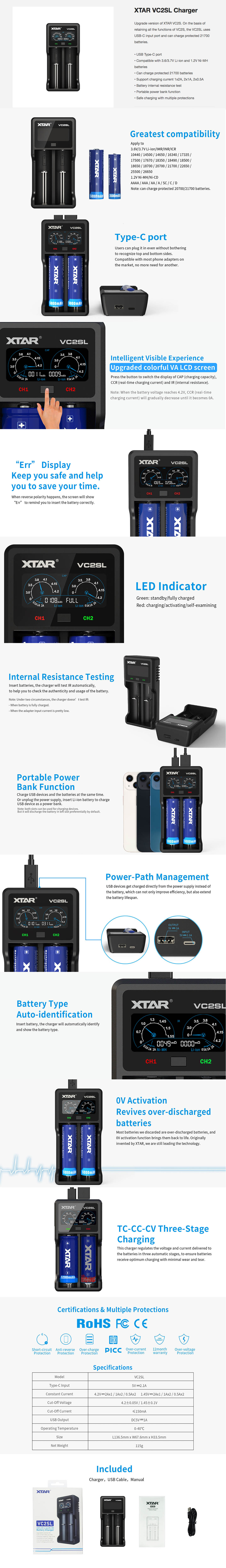 XTAR VC2SL 2 slot USB powered smart charger for 14500 16340 18700 26650 18650 21700 18500