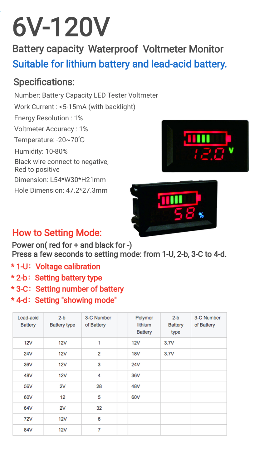 6V 12V 24V 36V 48V Battery Capacity Voltmeter Monitor 4 Lithium Li-ion lifepo4