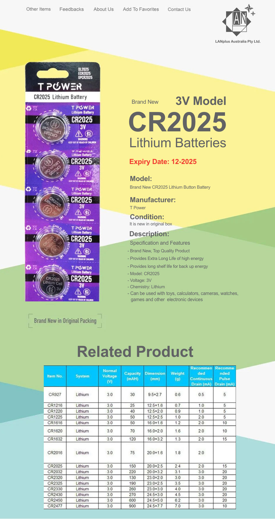 100x 3V CR2025 battery Lithium Coin Cell Button battery DL2025 ECR2025 GPCR2025