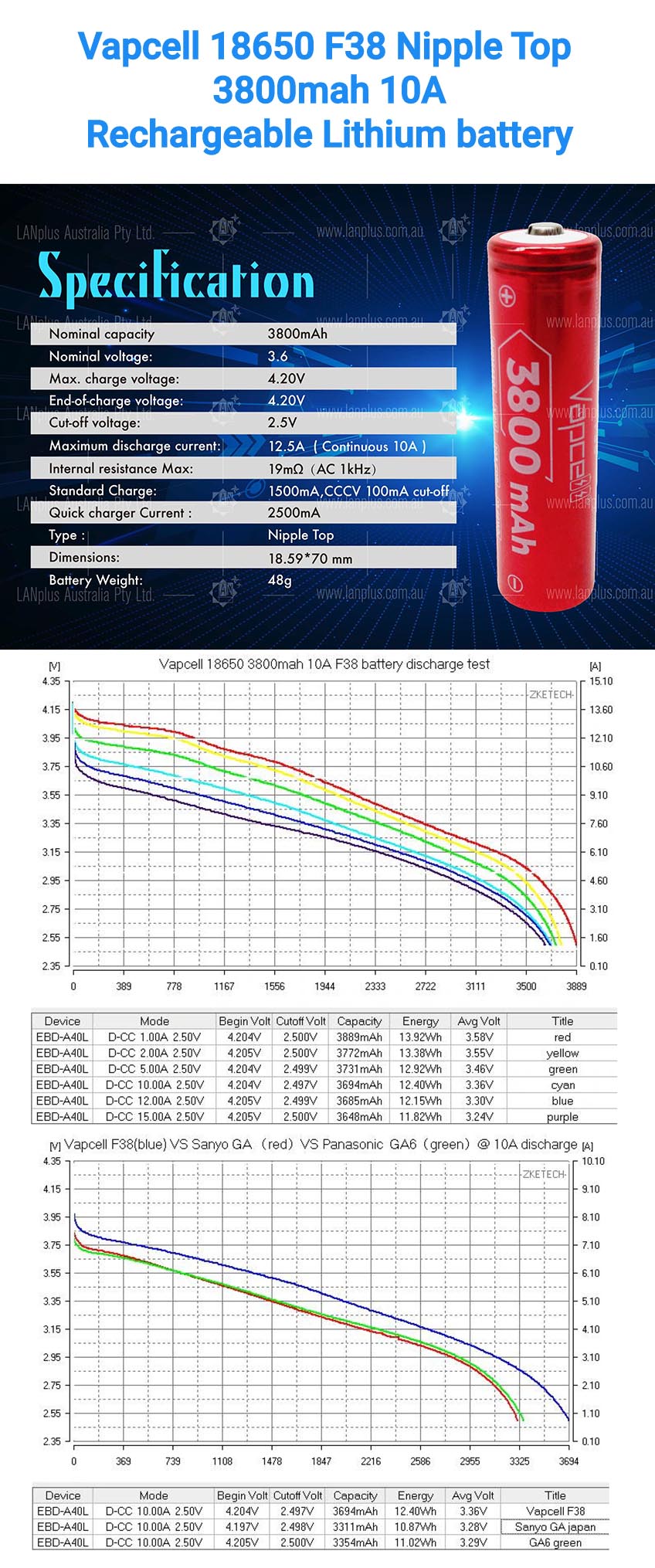 2x F38 INR18650 3800mAh 10A 3.7V HIGH CURRENT Rechargeable Nipple Top lithium Battery