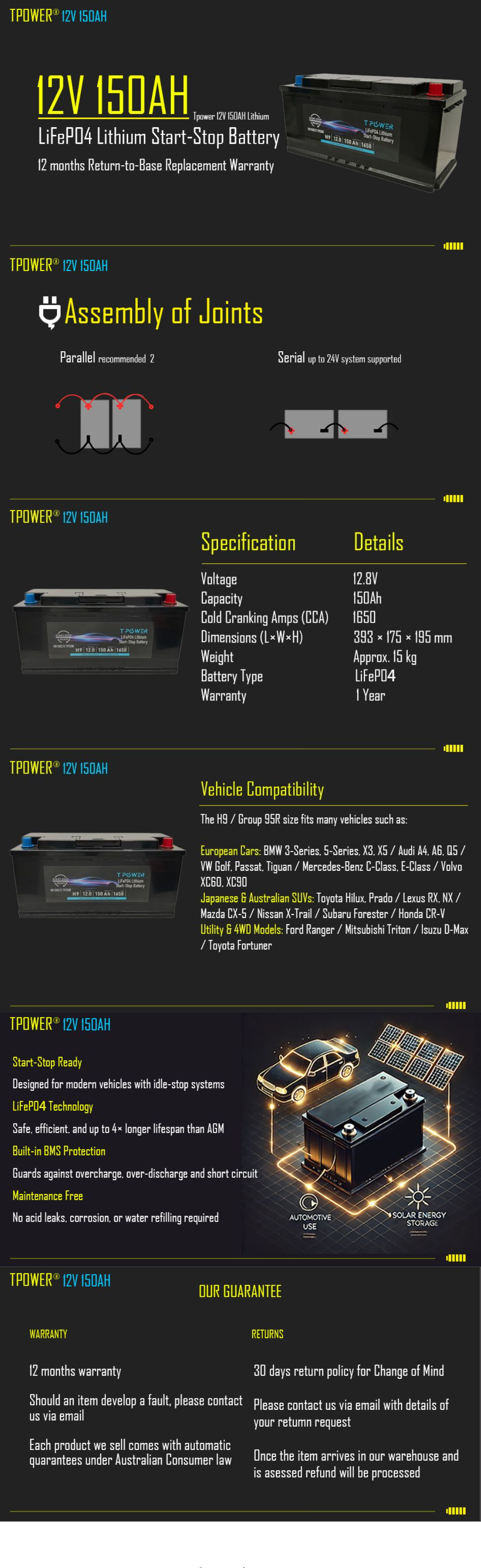 Start-Stop 12V 150Ah 1650CCA LiFePO4 Start-Stop Car Battery H9 Group 95R