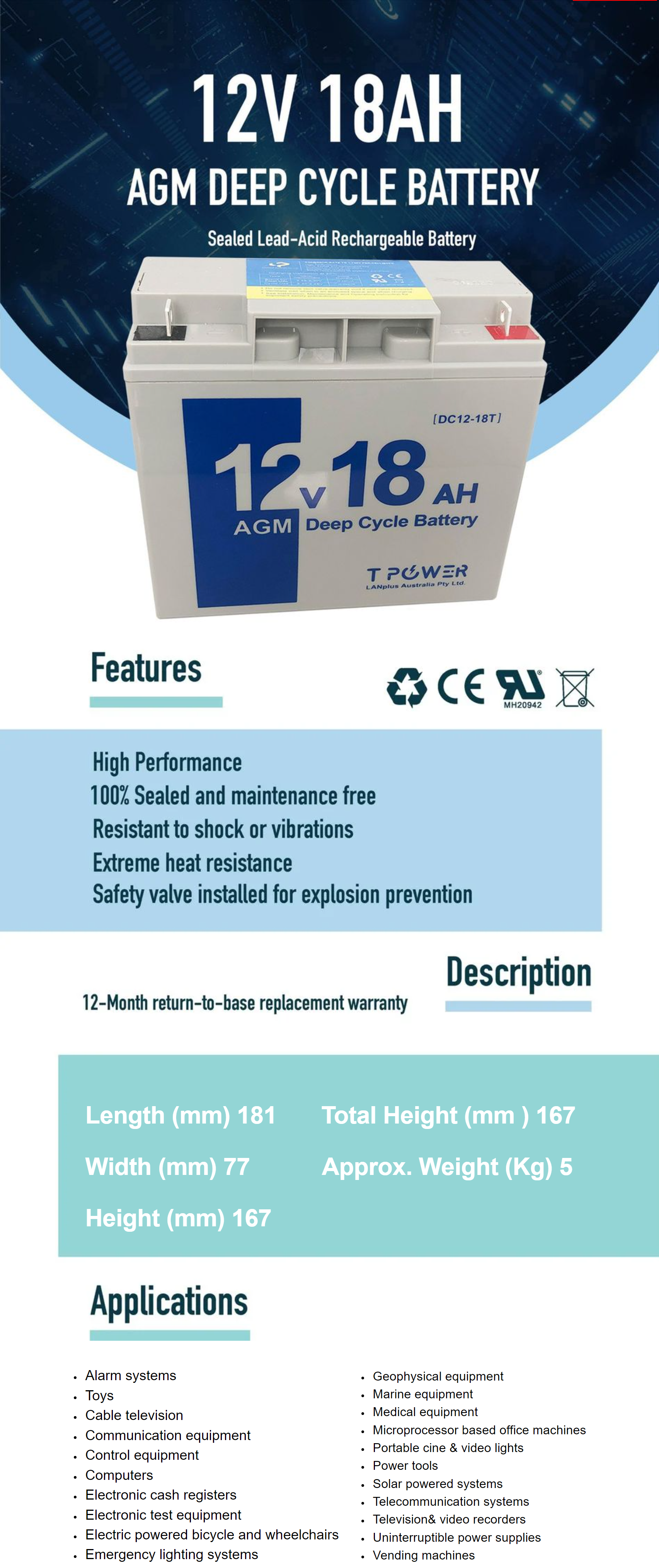 Tpower NEW 12V 18AH Sealed Lead-Acid Battery AGM 17ah 4 UPS Solar scooter Jet