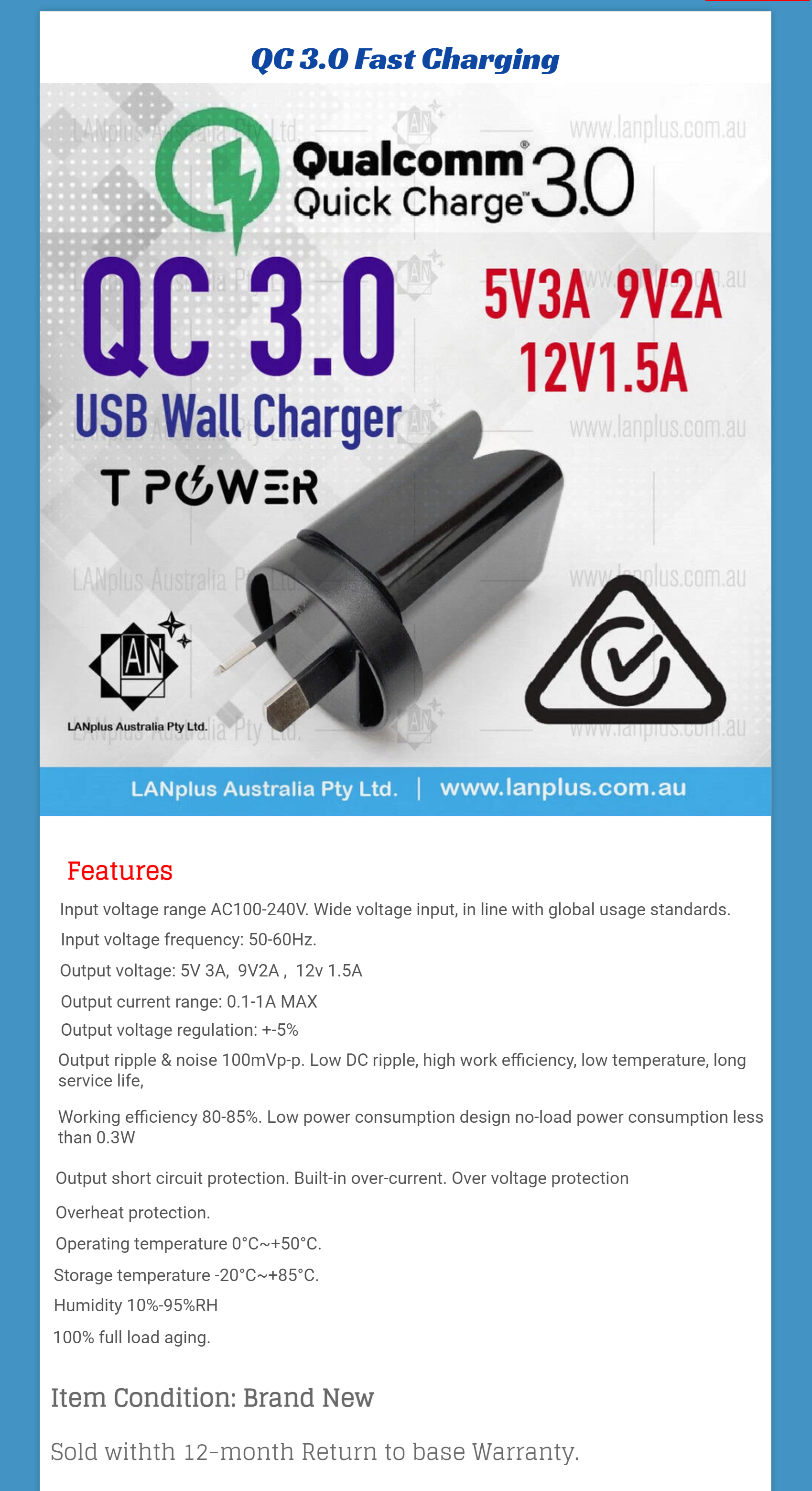 Quick Charge QC 3.0 super fast usb wall charger 18w au adapter saa certified