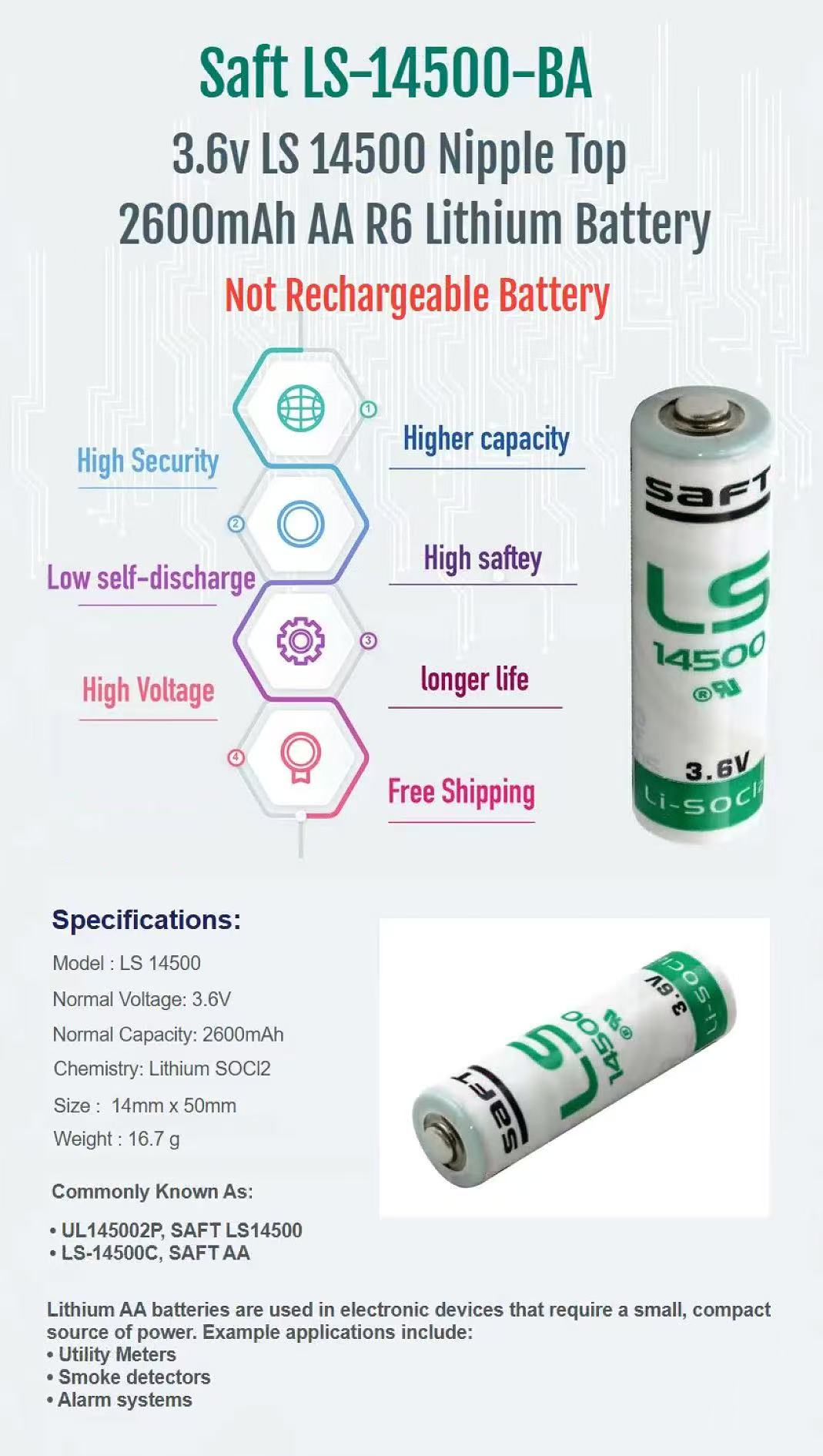 2x Saft LS14500 3.6V 2600mAh Lithium Battery AA size R6 Li-SOCl2 nipple top