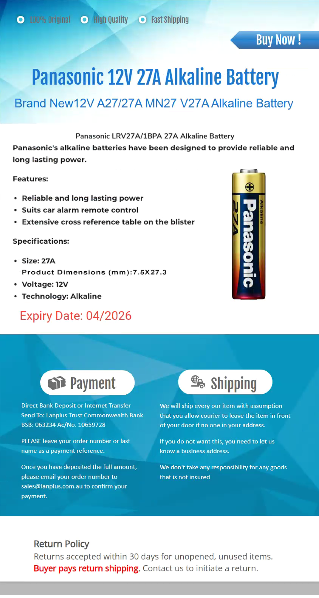 Genuine Panasonic A27 27A MN27 V27A Battery Garage Remote Alarm 12V